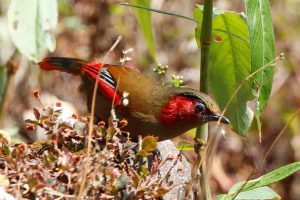 7. Tag: Wir fahren nach Norden mit vielen kurzen Exkursionen an interessanten Punkten entlang der Straße (Sultanmeise, Waldhäherling, Königsmeise, Blauschwanz, Besra-Sperber, Blaufügelsiva, Jagdelster, Grünelster, Weißbauchyuhina, Scharlachnektarvogel, Blauschwanzminla, Rotkehlfälkchen). Unser Ziel ist Tingtibi (540 m).