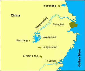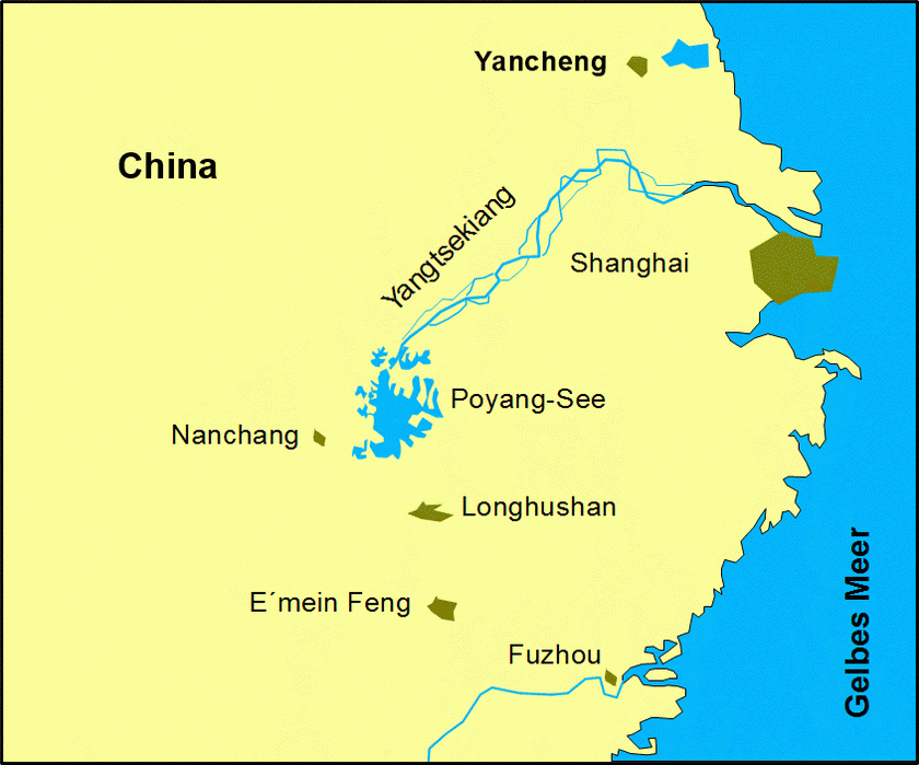 Das breite Tal des Yangtsekiang-Flusses mit seinen zahlreichen Flachwasserseen und riesigen Reisfeldern ist eines der bedeutendsten Überwinterungsgebiete für Kraniche und Wasservögel in der gesamten Ostpaläarktis. Erst in den 80er Jahren gelang chinesischen Ornithologen hier am Poyang-See die sensationelle Entdeckung des weltweit bedeutendsten Überwinterungsplatzes des Schneekranichs. Nachdem die Winterbestände des Schneekranichs in Nordindien und im Iran am Südrand des Kaspischen Meeres im letzten Jahrzehnt nahezu erloschen sind, beherbergt dieses Gebiet im Winter mit bis zu 2.500 Vögeln nahezu 95 % dieser vom Aussterben bedrohten Art. Neben dem Schneekranich sind im Winter bis zu 5 weitere Kranicharten im Yangtse-Tal anzutreffen, sowie andere interessante Schreitvögel wie Löffler und Schwarzschnabelstorch. Zugleich sind die ausgedehnten Feuchtgebiete am Yangtse zu dieser Jahreszeit bevölkert von Zehntausenden überwinternder Singschwäne und Zwergschwäne, Gänse, Enten und Watvögel, darunter so attraktive Arten wie die Kaisergans.