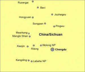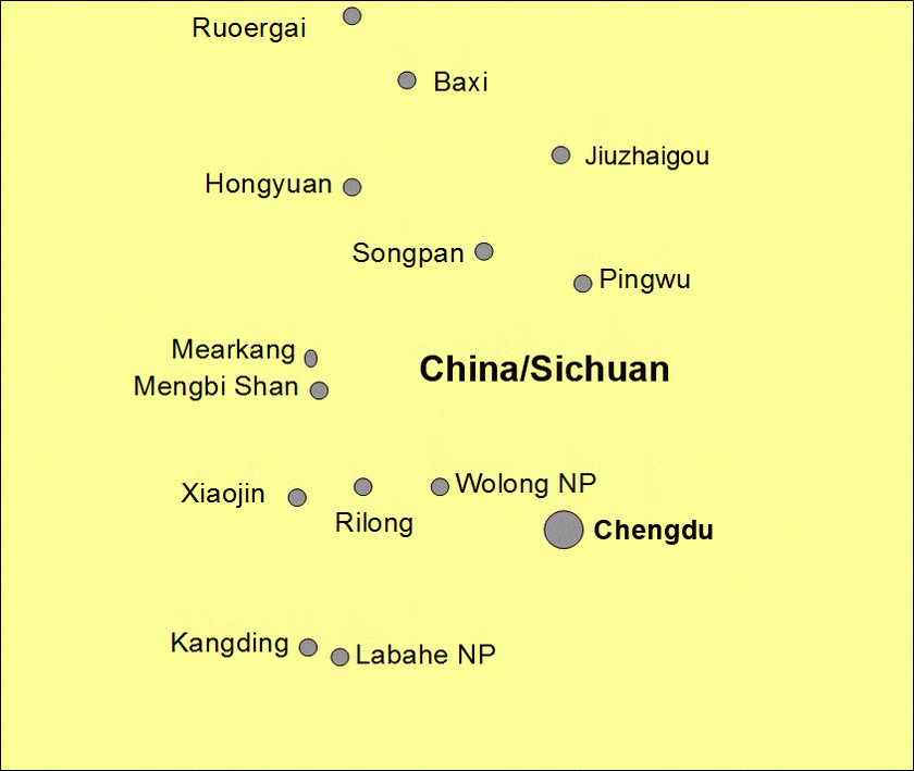 5. Tag: Nach einer morgendlichen Exkursion fahren wir weiter nach Wolong. Die Fahrt dauert etwa 5 Stunden. Das 2.000 qkm große und landschaftlich sehr schöne Wolong Naturreservat, in dem 10 % der frei lebenden Pandabären vorkommen, wurde 1980 eingerichtet. Auf einer spätnachmittäglichen Exkursion suchen wir noch Goldfasan, Blauammer, Rubingimpel, Orangenachtigall, Omeilaubsänger, Bartstreifhäherling, Wellenhäherling, etc.