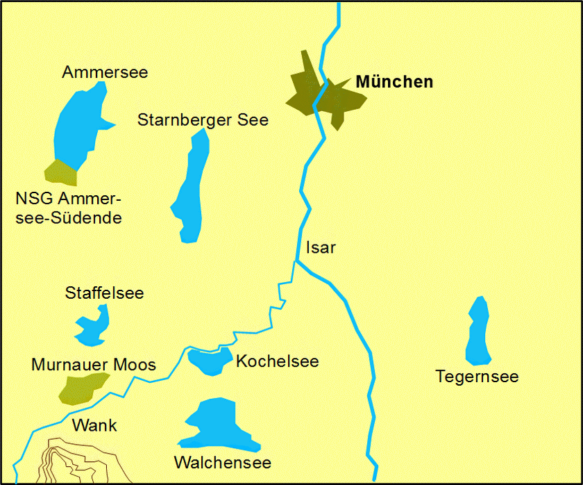 1. Tag: Abfahrt am Bahnhof Bensheim. Nach Bezug der Quartiere am frühen Nachmittag Exkursion ins Loisach-Kochelsee-Moos. Auf den Streuwiesen und in den ausgedehnten Schilfgebieten u.a. Rohrweihe, Bekassine, Großer Brachvogel, Braunkehlchen, Wiesenpieper und Rohrschwirl, Massenbestände an Orchideen, Sibirischer Schwertlilie u.a. seltenen Pflanzen.