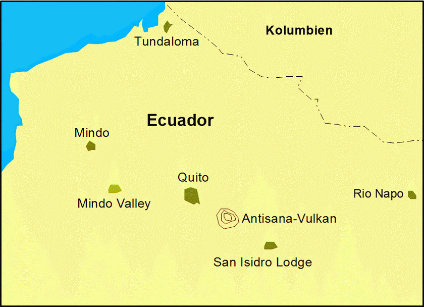 4. – 6. Tag: In diesen drei Tagen besuchen wir u.a. ein privates Reservat (Angels Place) mit einem Felsenhahnbalzplatz. Der Besitzer füttert dort auch erfolgreich Arten wie Riesen-Ameisenpitta, Gelbbrust-Ameisenpitta und Tukan-Bartvogel an. Außerdem besuchen wir das Mindo-Valley (Rotkopf-Bartvogel, Goldkopf-Quetzal), das private Reservat Rio Silanche in Richtung Küste (Choco-Tukan, Goodsontaube, Himmelsperlingspapagei, Glanzflügelpapagei, Schläfenfleckspecht, Guayaquilspecht, Schwarzkopf-Ameisendrossel), das Gebiet um Milpe (Sichelguan, Prinzenbussard, Fahltaube, Schwarzer Ameisenvogel, Keulenschwingen- und Goldschwingenpipra) und Bellavista (Zimtbindenspecht, Leistenschnabeltukan, Bergwald-Baumsteiger, Perlmantel- und Ecuador-Rostflankentapaculo, Türkishäher).