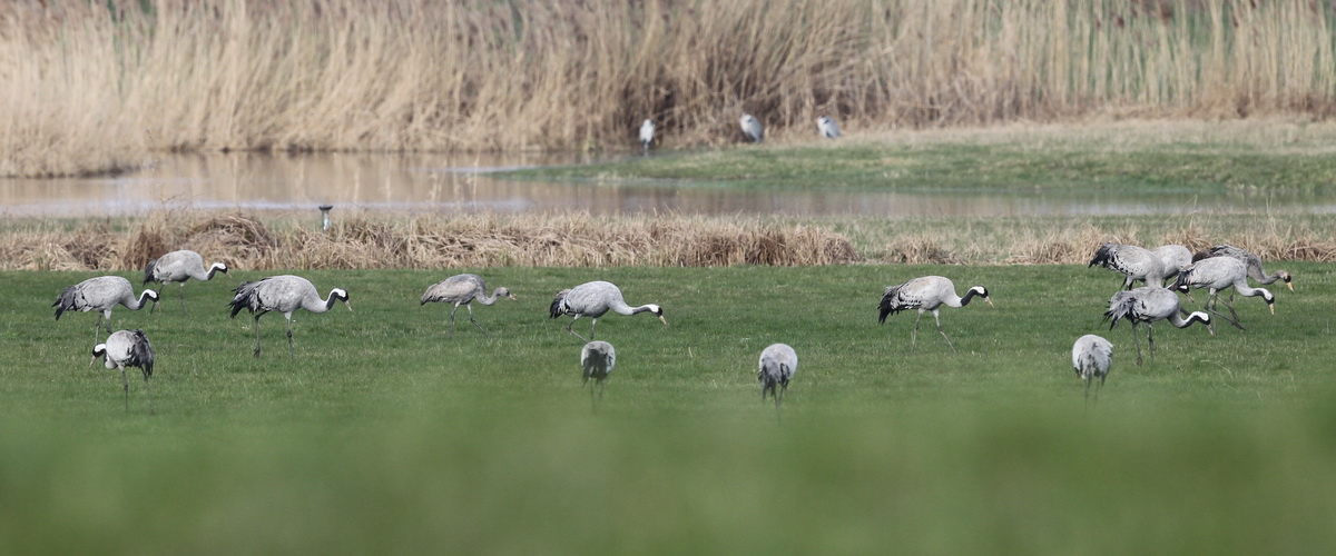 Im IBA Schutzgebiet Käing, auf der Halbinsel Kassarie, suchen wir unter den großen Trupps von Kranichen, Graugänsen, Weißwangengänsen und Blässgänsen nach den seltenen Zwerggänsen, die hier immer wieder nachgewiesen werden und an der Küste nach Odinshühnchen und Sichelstrandläufer.