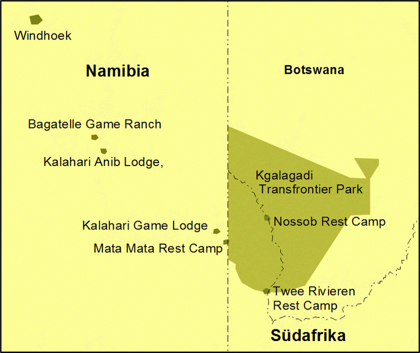 4. – 9. Tag: Wir fahren in den Kgalagadi-Transfrontier-Nationalpark, der sich hier von Botswana aus über Südafrika bis zur namibischen Grenze ausdehnt. Die nächsten 6 Nächte werden wir in zwei oder drei verschiedenen Lodges verbringen, um den Park ausgiebig zu erkunden. Geplante Lodges sind das Twee Rivieren Rest Camp, Nossob Rest Camp und das Mata Mata Rest Camp.