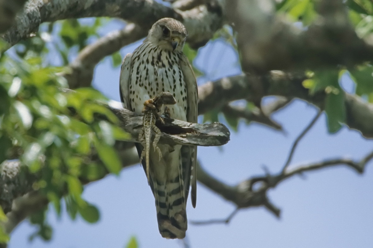 11. Tag: Heute fahren wir durch savannenartige Landschaften mit Didiereaceae und verschiedenen Affenbrotbäumen (Schwarzohrmilan, Madagaskar-Rebhuhn, Helmperlhuhn, Kaptäubchen, Palmensegler, Kapsegler, Hovalerche) nach Ranohira. Wir besuchen den Zombitse-Nationalpark, in dessen Bergtrockenwald Grosser Vasapapagei, Grauköpfchen, Coquerel’s-, Riesenseidenkuckuck, Madagaskar-Buschkauz, Madagaskarnachtschwalbe, Kurol, Appert’s Bülbül, Rotschwanzvanga, Rotvanga und Malegassendajal ihr Brutgebiet haben. In den Trockenwäldern leben auch Südlicher Rotstirnmaki, Larvensifaka, Hubbard’s Wieselmaki sowie Teppichchamäleon, Riesenchamäleon, Kleiner Madagaskarleguan, Sakalava-Nachtgecko, Grüner Taggecko (Phelsuma standingi), Glattechse, Madagaskar-Hakennasennatter und Mahafaly-Natter. In der Nähe unseres Hotels suchen wir am Abend noch nach Madagaskar-Rebhuhn, Kapohreule und Madagaskar-Eule.