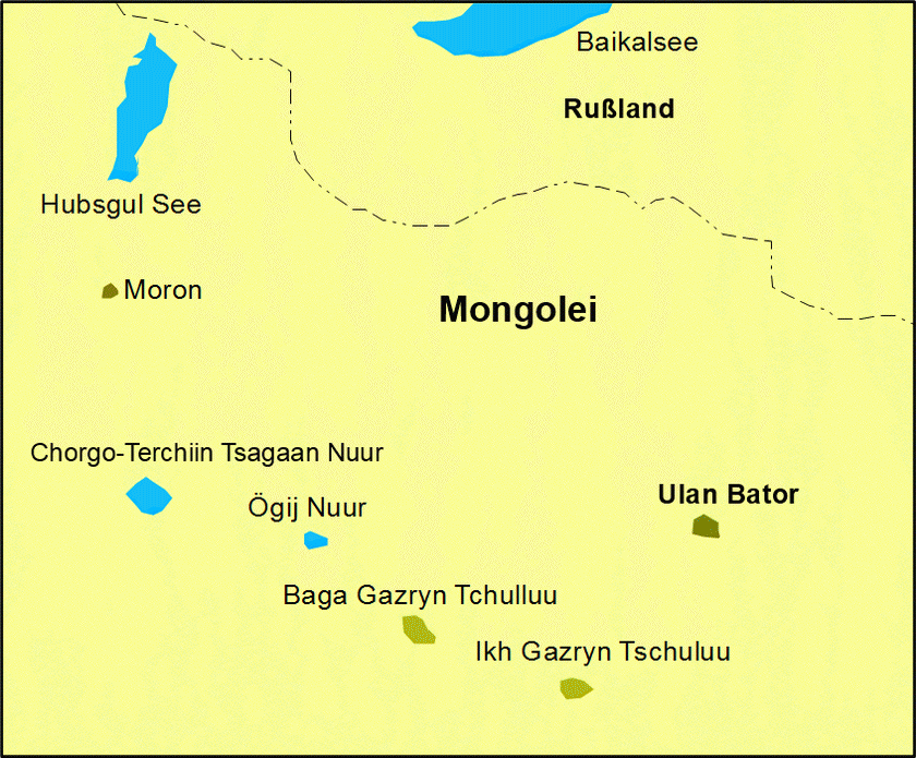 Mit einer Fläche von ca. 1,56 Mio qkm und nur 2,5 Mio Einwohnern (1,5 Einwohner/qkm) gehört die Mongolei zu den am dünnsten besiedelten Ländern der Erde. Das Wegesystem ist durch unbefestigte Pisten geprägt und auch feste touristische Anlagen sind klein und meist landestypisch als Jurtencamps errichtet. Deshalb ist man für Reisen durch das Land auf Geländefahrzeuge und Zelte angewiesen.