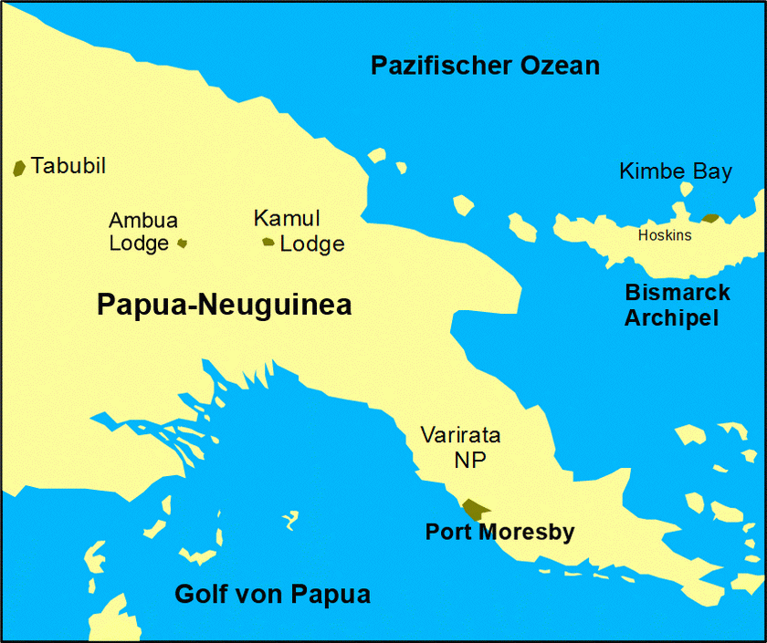 Unsere Reise führt uns auf die 462.840 km² große östliche Halbinsel Papua Neuguinea, auf der allein 26 Paradies- und 7 Laubenvogelarten vorkommen. Über 90% des Landes sind noch von dichtem Regenwald bedeckt. Ab 3.000 m Höhe wird der Wald von Hochgebirgsvegetation abgelöst. Höchste Erhebung ist der Mt. Wilhelm (4.508 m NN). Viele Gebiete sind weitgehend unzugänglich und erst in den 30er Jahren des letzten Jahrhunderts wurde mit der systematischen Erforschung des Binnenlandes begonnen.