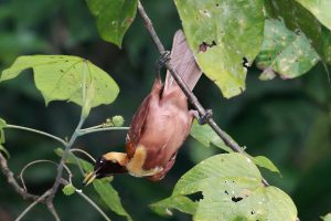 6. Tag: Wir besuchen noch einmal einen Balzplatz des Nacktkopf-Paradiesvogels. Weitere Arten, die die Balzplätze besuchen sind Goldbrusttaube, Fasantaube, Blaubrustpitta, Braunrücken-Waldhuscher, Fahlschnabelsericornis und mit viel Glück können wir auch die endemische Braunbrusttalegalla beobachten, die hier gelegentlich vorbei kommt. Nach dem Mittagessen haben wir die Möglichkeit, nach dem Roten Paradiesvogel zu suchen, oder man beobachtet nach Lust und Laune in der Umgebung. Oft gesehen werden hier Waldfischer, Rotbauchliest, Spatelliest, Glanzkuckuck, Amboinasittich, Weißohr-Laubenvogel, Langschnabelhonigfresser, Aruhonigfresser, Elfengerygone, Gelbbauchgerygone, Aruschnäpper, Graudickkopf, Waldpitohui, Braunparadieskrähe, Rosenberg-Fächerschwanz, Perlenflügel-, Goldmonarch, Krausenmonarch, Gelbbauch-Flachschnabel, Papuamistelfresser, Weißbüschel-Beerenpicker, Gelbbauchpfriemschnabel, Graubauchpfriemschnabel und Zwergpfriemschnabel.