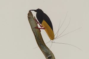 9. Tag: Nach einem nächtlichen Frühstück fahren wir ca. 90 Minuten in ein Auenwaldgebiet, um die Balz des Fadenparadiesvogels zu beobachten. Wir müssen noch im Dunkeln an der Beobachtungsstelle sein, um den Balztanz dieses seltenen Paradiesvogels zu beobachten. Oft werden hier auch Veilchenkappen-Fruchttaube, Langschnabelkuckuck, Bartbaumsegler, Spatelliest, Schönlori, Strichelkopf-Honigfresser, Gelbkinn-Honigfresser, Waldwürgerstar, Dickichtfächerschwanz und Zweifarbenmonarch gesehen.